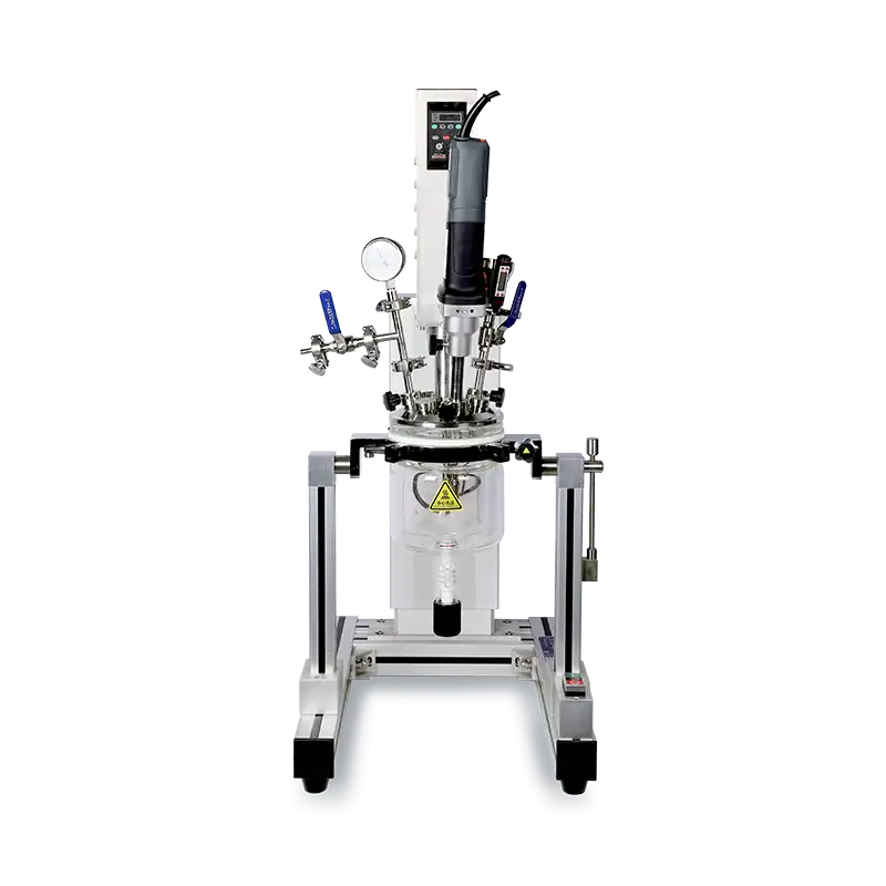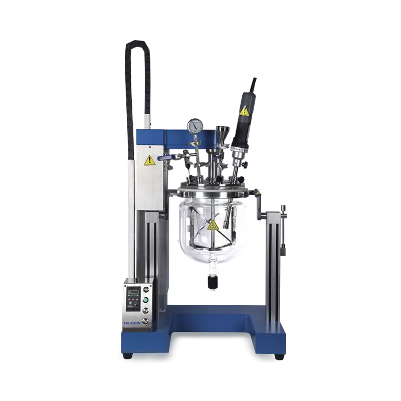 3、玻璃反应釜,带夹套和下放料,夹套的进出口可外接加热/冷却循环器,通过液体在夹套内的循环实现对反应釜内的物料进行加热或冷却;